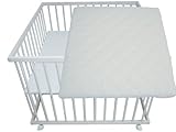 Stabiles Laufgitter aus bestem, weiß lasiertem Buchenholz in der Größe 100x100 mit Matratze